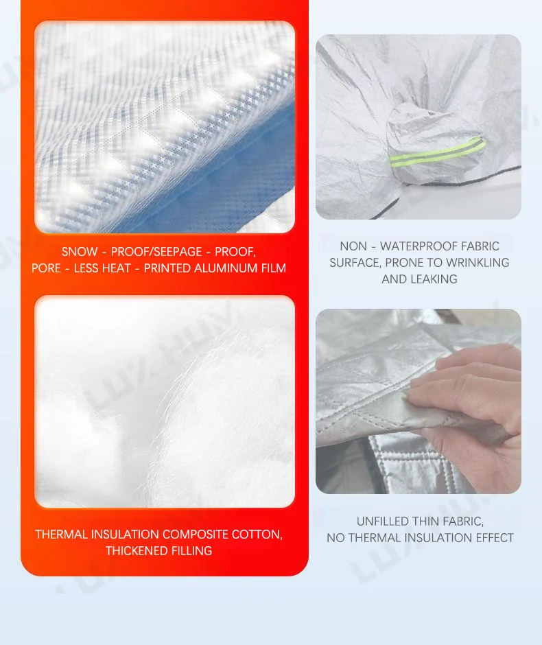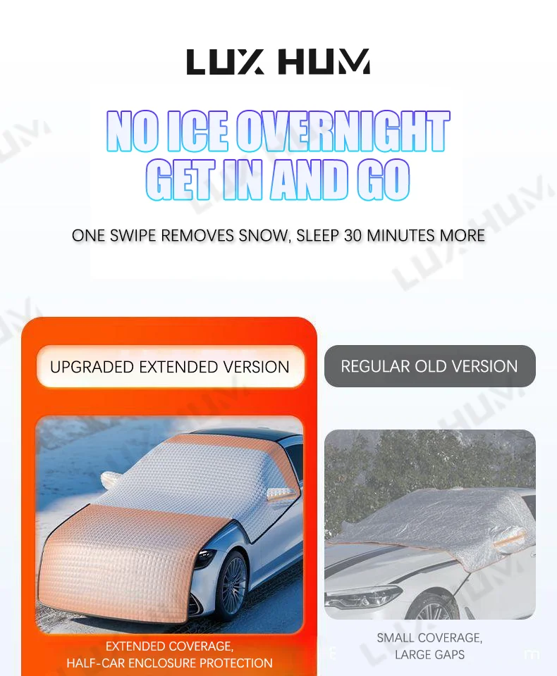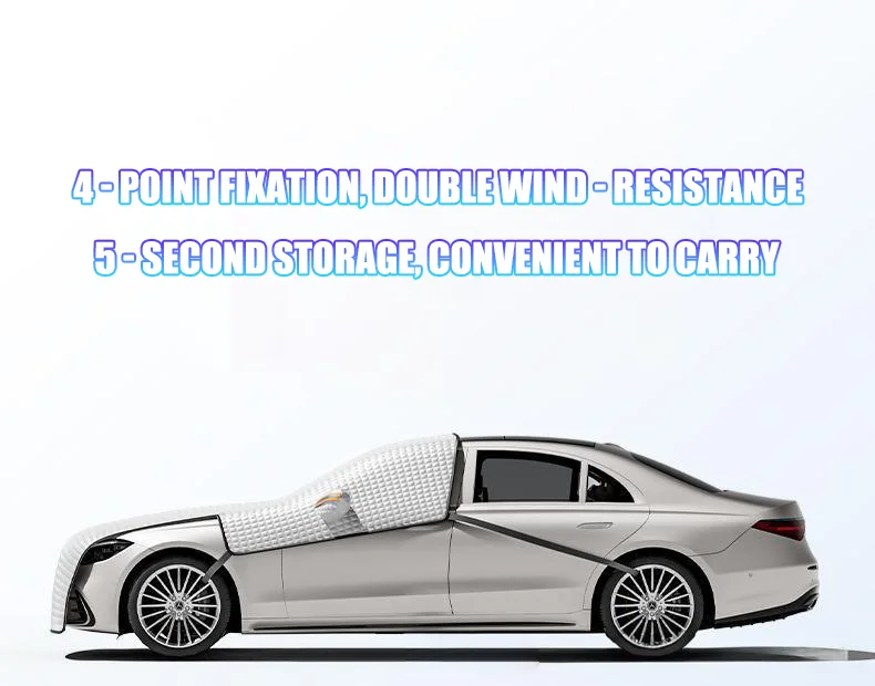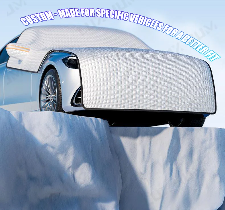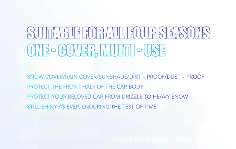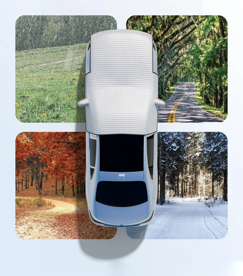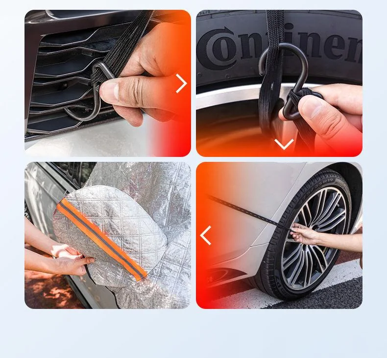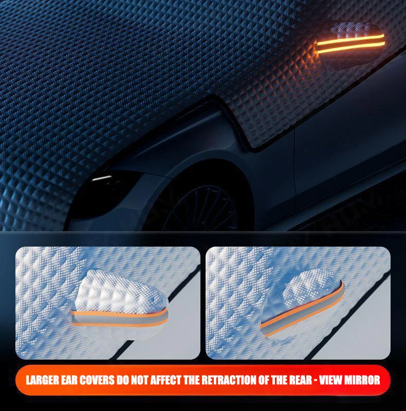2. All-Season Versatility:Works as a winter snow cover, summer sun shield, and rain protector. Reflective strips enhance nighttime visibility for added safety,Perfect for snowy driveways, mountain trips, and long-term parking.